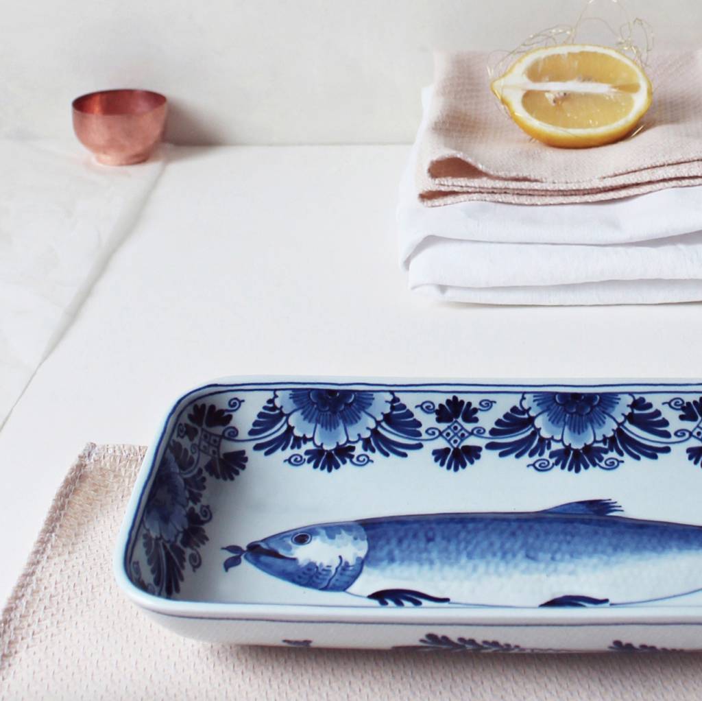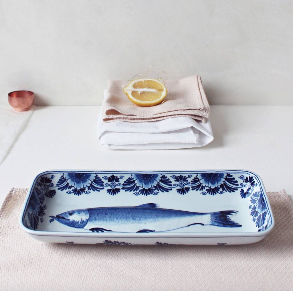 Delfter Blaue Fisch Schale Rechteckig von 29x12,5 cm. Handgemalte Schalen aus Delfter blau Porzellan. Diese originale Heringsschalen werden aus das beste Porzellan hergestellt. Delfter blaue fisch schale mit Hering- und Blumenmotiven. Delfter blau Fisch Schalen für Feinschmecker!