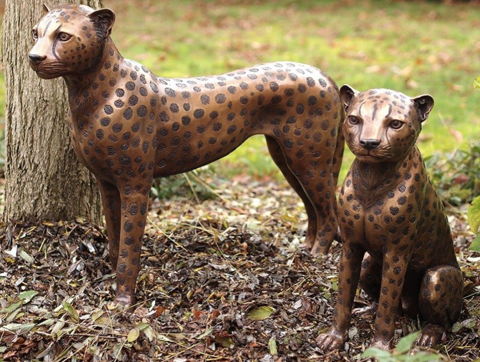 Gartenskulptur Gepard: Gepard Statuen aus Bronze. Gepard Gartenstatue, Set von zwei Bronze Statuen. Gepardstatue im XL-Format. Gepardenstatuen aus hochwertiger Bronze. Diese Gepard Gartenskulptur wird mit einem Zertifikat geliefert. Diesen Garten Skulpturen bringt die afrikanische Savanne näher nach Hause!