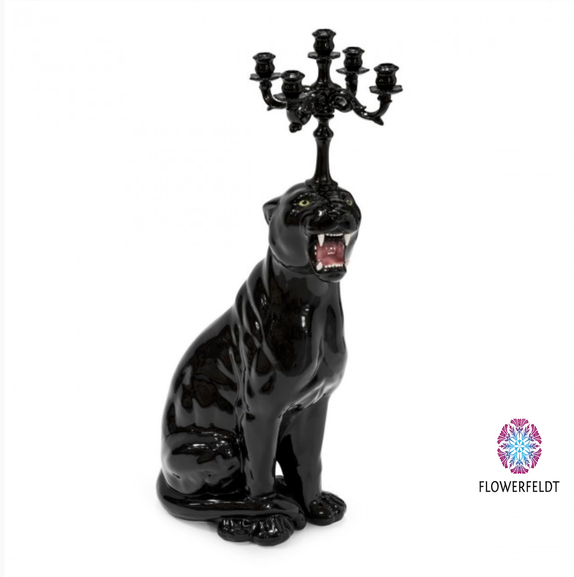 Extravagante Leopard Kerzenhalter aus Porzellan. Dieser schwarze Kerzenständer ist 90 cm hoch. Dekorativer Kerzenhalter in Hochglanz schwarz. Diese sitzenden Leopard Kerzenständer ist ein zeitloses Schmuckstück für jedes Interieur.