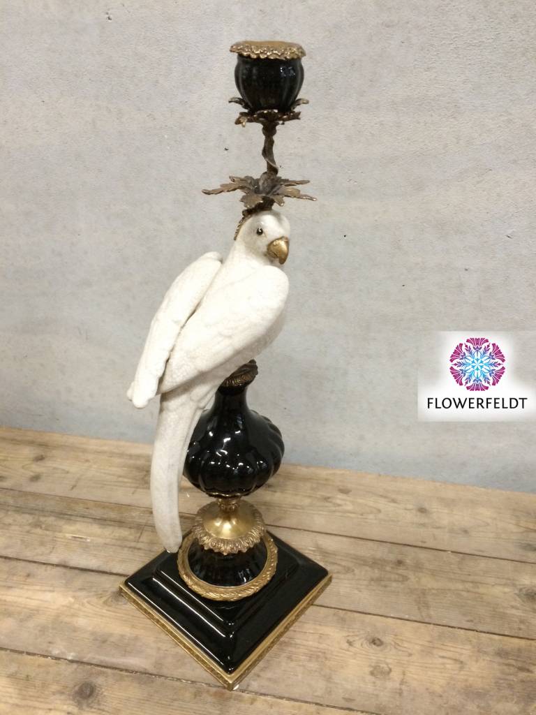 Wunderschöne Papageienkerzenständer aus der Flowerfeldt® Kollektion. Luxus Wohnaccessoire für echte Feinschmeckers. Diese Kerzenständer mit Papageien sind handgefertigt. Ein schöner Blickfang für Ihr Interieur. Schwarzweiße Papageien Kerzenhalter aus Porzellan und Messing. Indem Sie einen linken und einen rechten Papagei Kerzenhalter miteinander kombinieren, können Sie einfach ein einzigartigen Effekt erzielen.