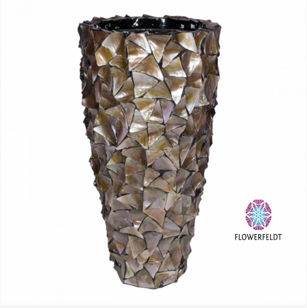 Braune Vase Monaco L von 96 cm. Exklusive Muschel Vasen online. Braune Vasen für den Innenraum. Luxus Übertopf für große Zimmerpflanzen. Braune Übertopf aus echten Muscheln hergestellt. Übertopf braun für jahrelangen Genuss. Bestellen Sie braune Vasen und braune Übertopfe bei Flowerfeldt®.