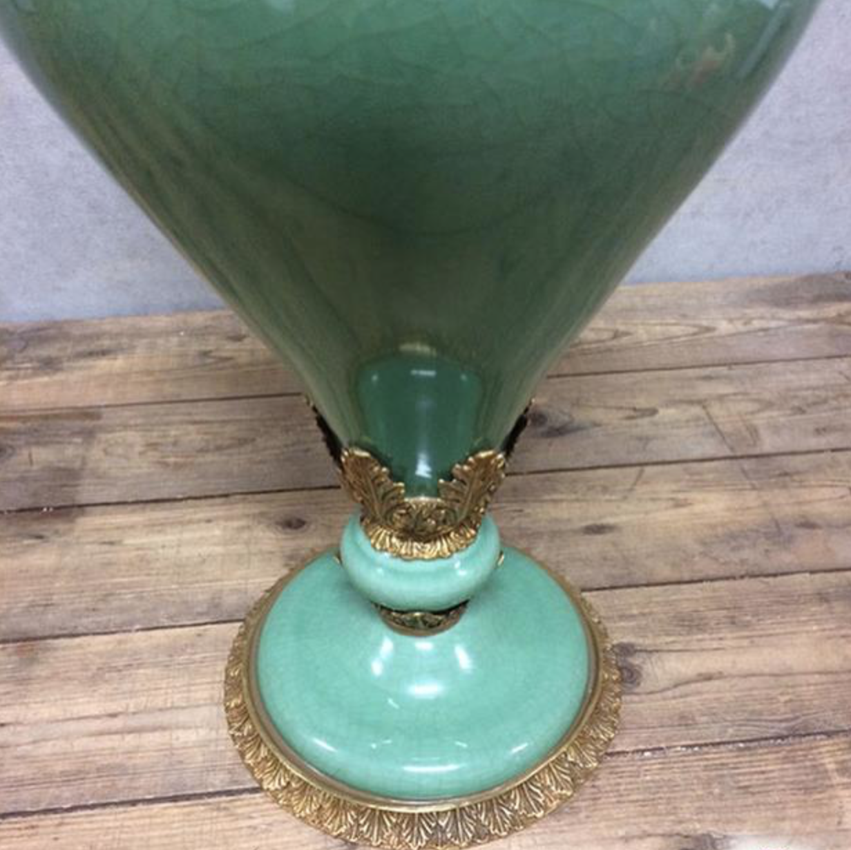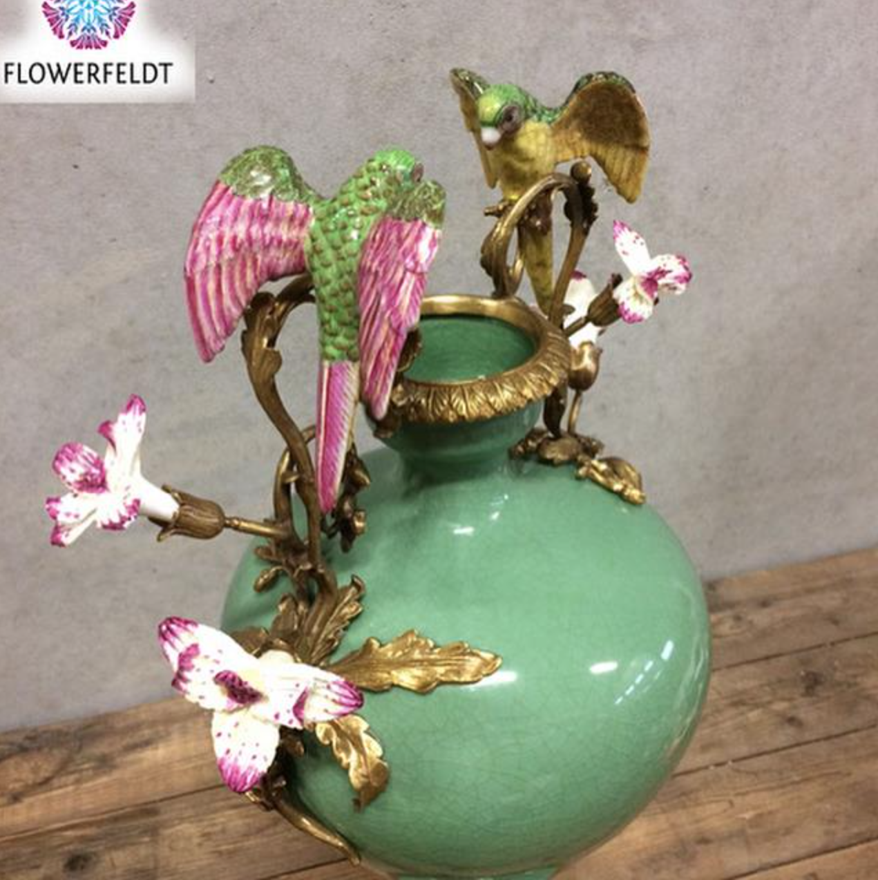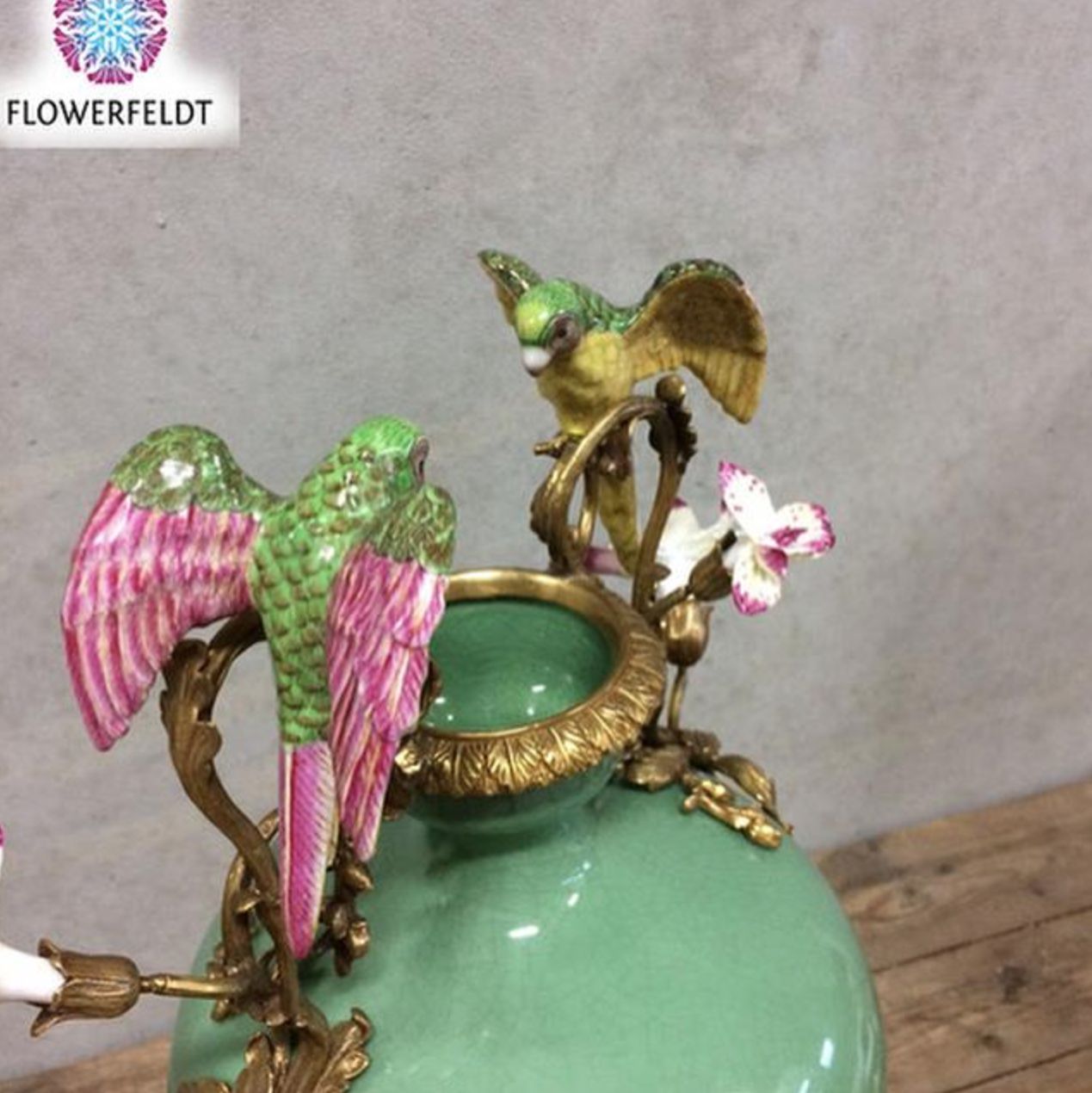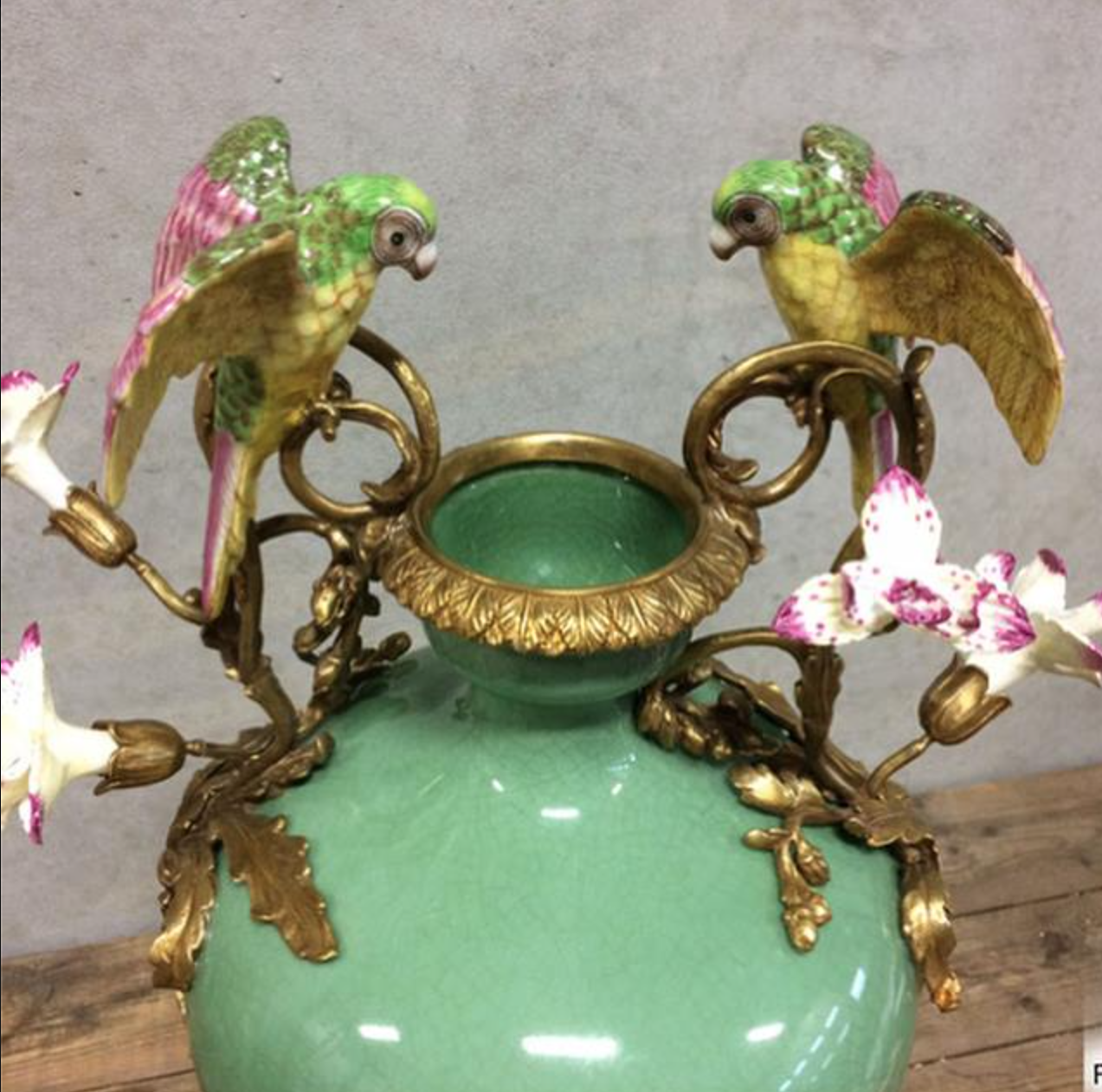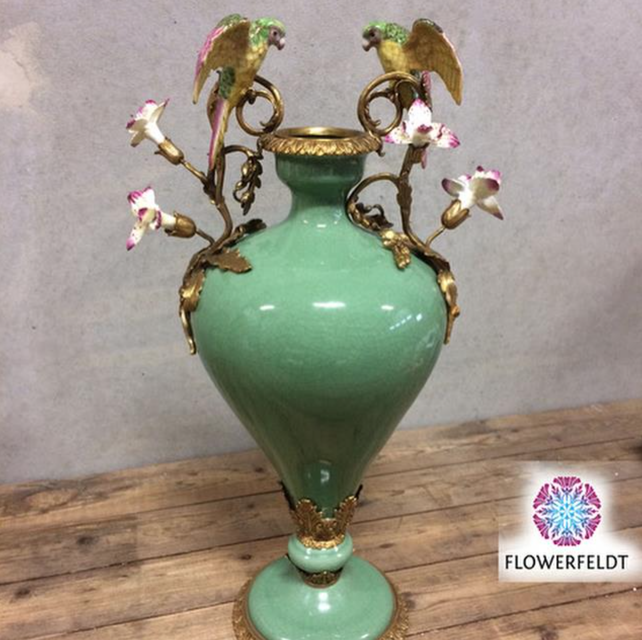 Papageien Vase mit stattlichem Aussehen. Diese Papegeienvase ist aus hochwertigem Porzellan hergestellt und hat wunderschöne Deko-Elemente. Grüne Vase mit einem sehr reichen Aussehen. Luxusvasen in einer sehr limitierten Auflage. Vasen grün von 55 cm Höhe. Dekovase für jahrelanges Vergnügen.