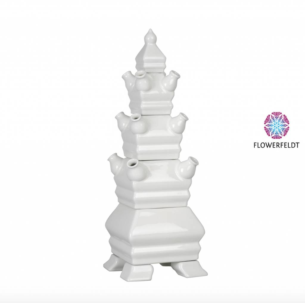 Weiße Pyramide Vasen von 48 cm hoch. Diese Dekovase in Weiß besteht aus fünf stapelbaren Teilen. Sehr hochwertige und robuste Pyramide Vase. Exklusive Vasen und Töpfe in Weiß können Sie einfach bei Flowerfeldt® kaufen.