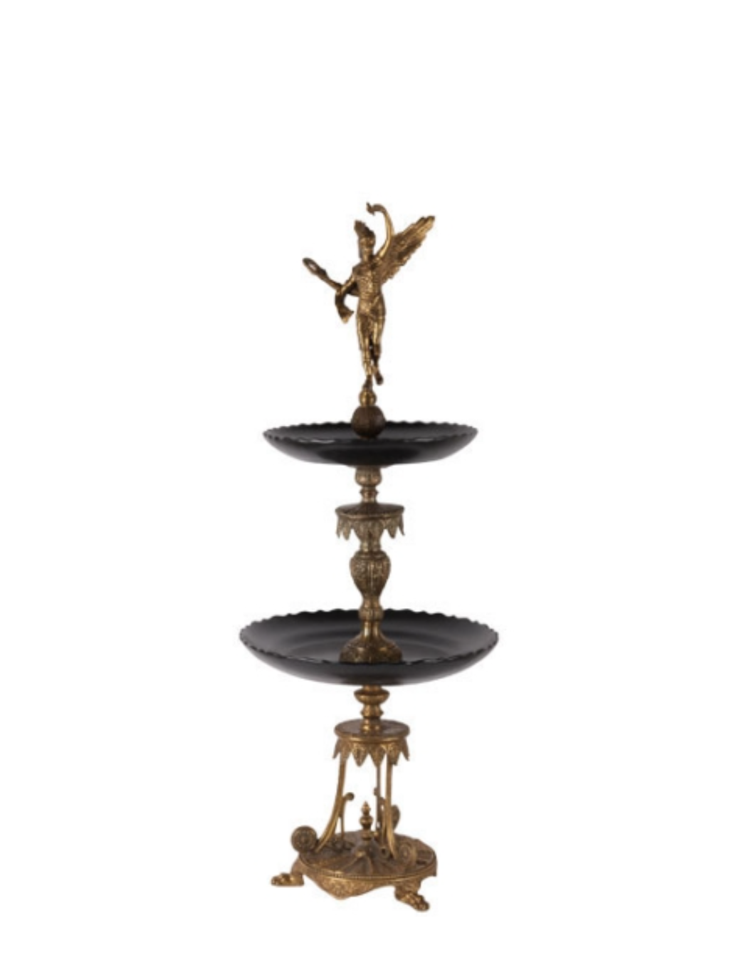 Vintage Etagere schwarz von 78 cm Höhe. Dieses schwarze Etagere besteht aus zwei Schichten. Etageres Schwarz aus Messing und Porzellan. Schwarze Etageres mit klassischem Look. Luxus Etagere für jahrelangen Genuss!