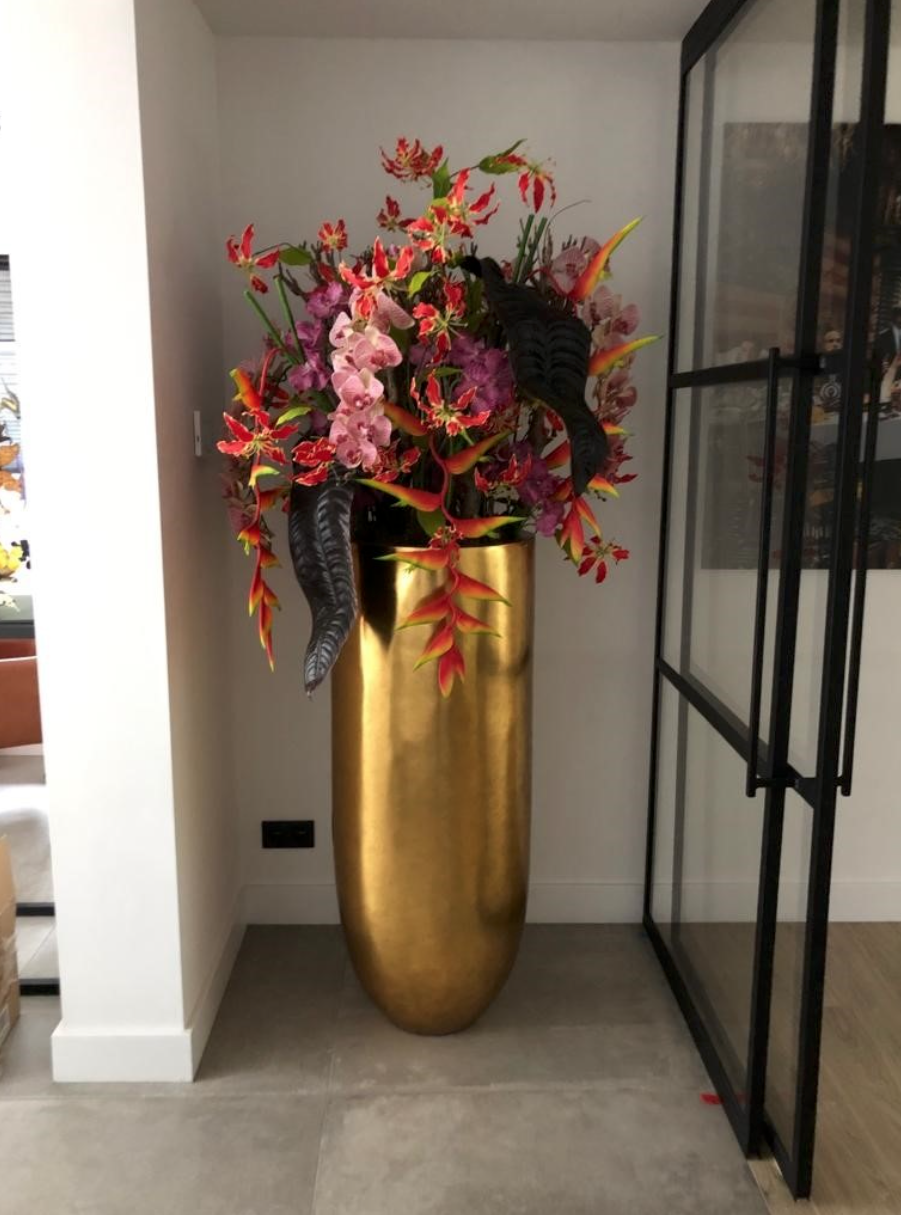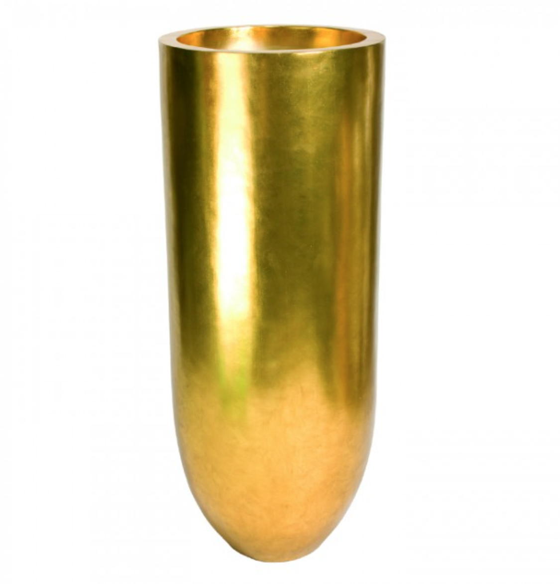 Aus der neuesten Kollektion! Blumentöpfe gold Cibola in glänzendem gold. Dieser goldene Übertopf ist aus Polystone hergestellt. Ideale Übertöpfe gold für hohe Pflanzen. Diese große Blumentopf gold ist von hoher Qualität und ist 125 cm hoch. Goldene Übertöpfe für eine beeindruckende Eingangs- oder Empfangshalle.
