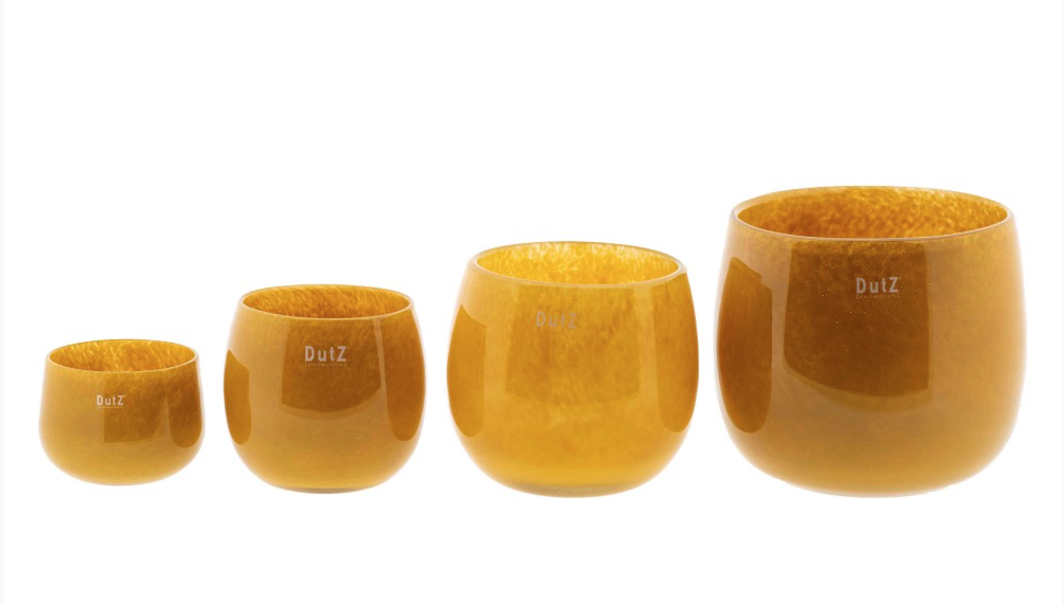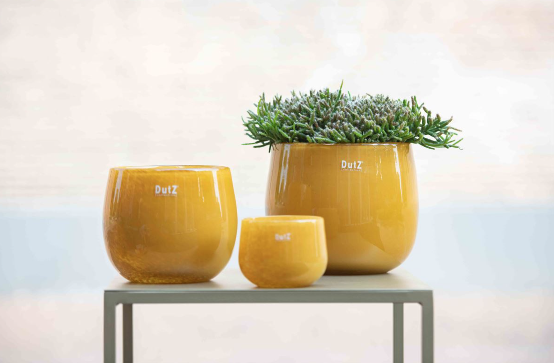 Übertöpfe Gelb Topaz aus der neue DutZ Kollektion. Diese gelbe Übertöpfe sind Mund geblasen. Das traditionelle Mundblasen von Glasprodukte ist ein zeitraubender Prozess. Es erfordert Geduld und jahrelange Erfahrung! Das Ergebnis ist jedoch immer eine einzigartige Blumentopf gelb mit Charakter. Das macht die Blumentöpfe gelb Topaz von DutZ etwas besonderes.