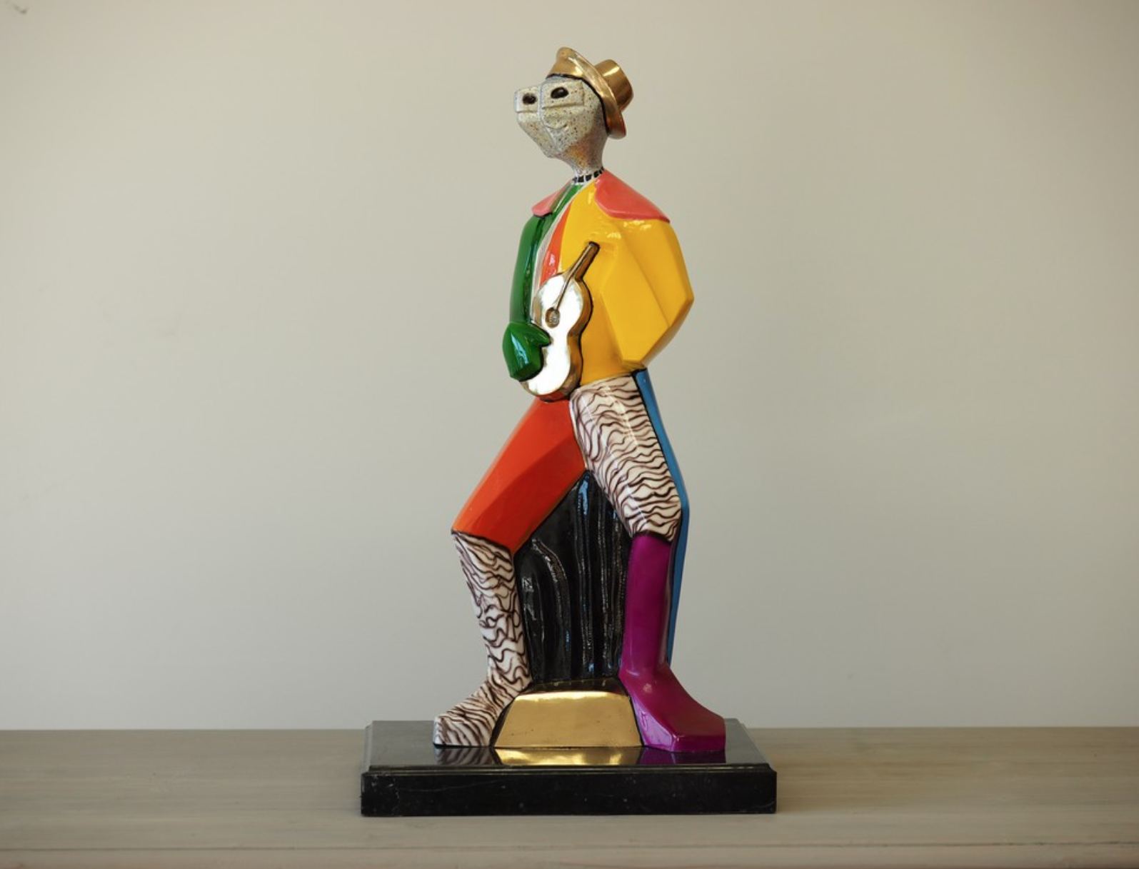 Art figure The Musician: modern art sculpture of a guitar playing lizard. Modern art figure The Musician is made of top quality bronze. Colorful bronze statues of 64 cm height. These modern statues will be delivered including a certificate. Modern sculptures with color and character!