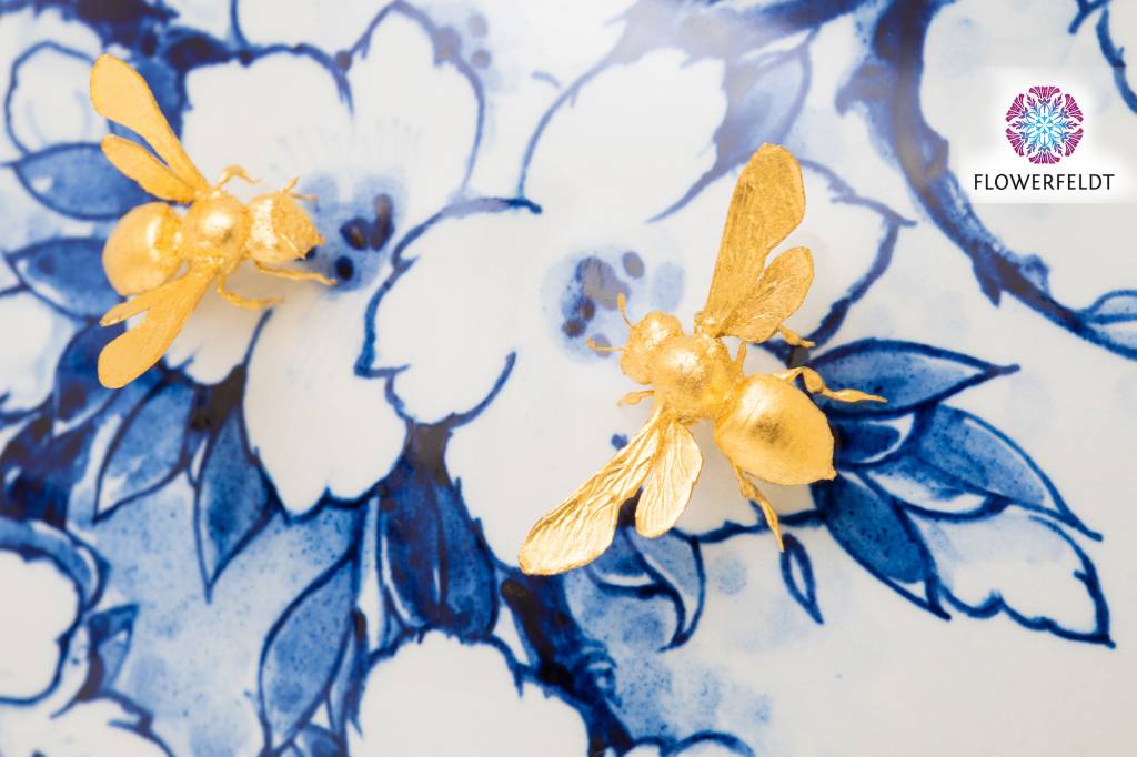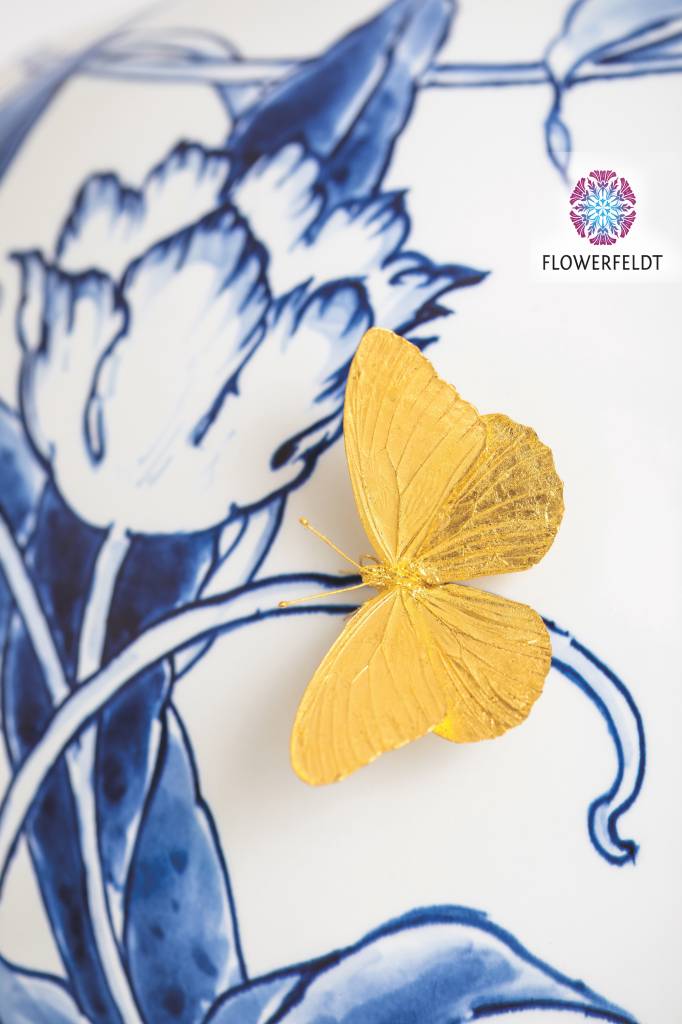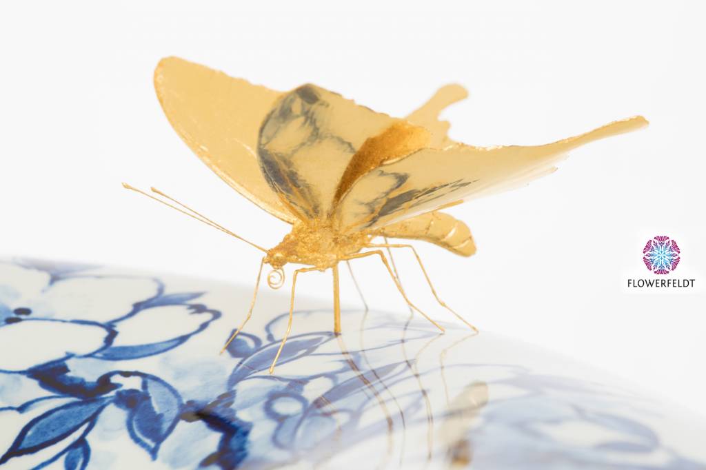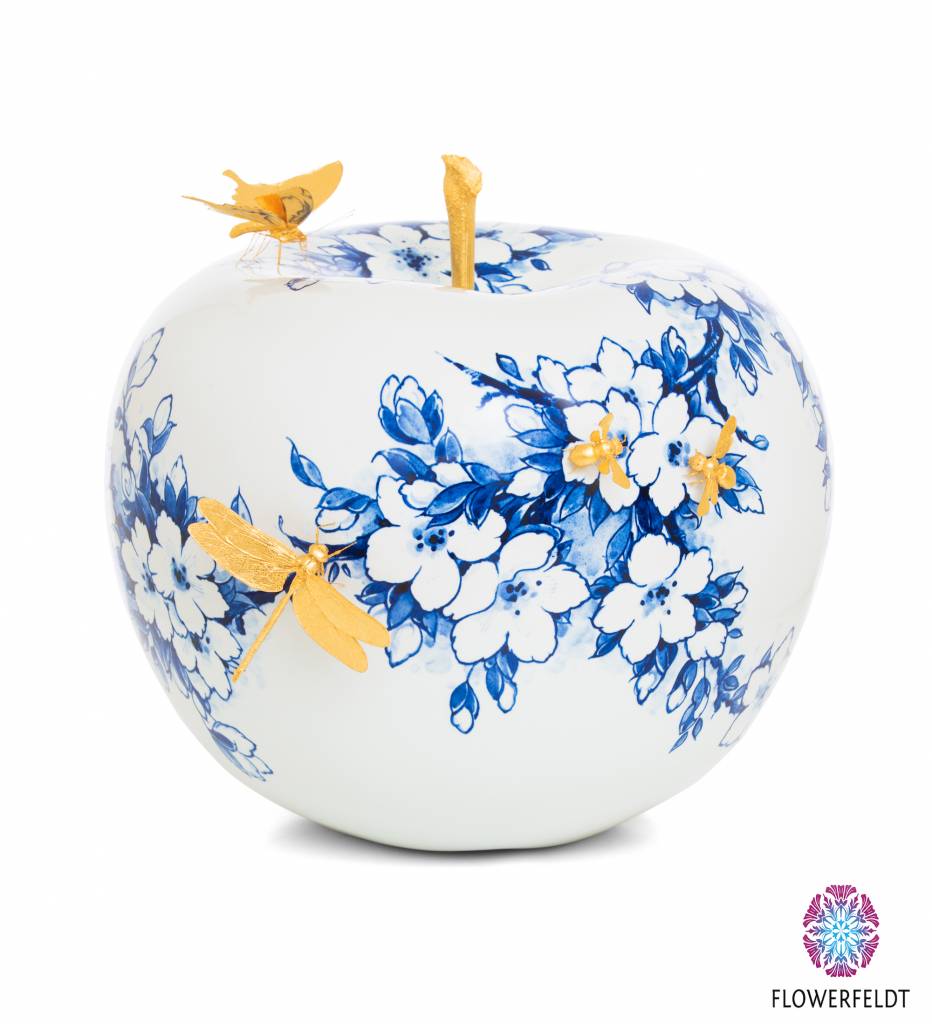 Simply magnificent! Handmade design apple with true-to-life insects in 24 carat gold leaf. These unique design apples are hand painted by one of the best master painters on the planet. Gorgeous decoration apples in characteristic Delft blue have an unique number and certificate of authenticity. This apple has a golden butterfly on top. A golden dragonfly and two bees in gold are positioned at the front. A very impressive art object for your country house, penthouse or outdoor residence.