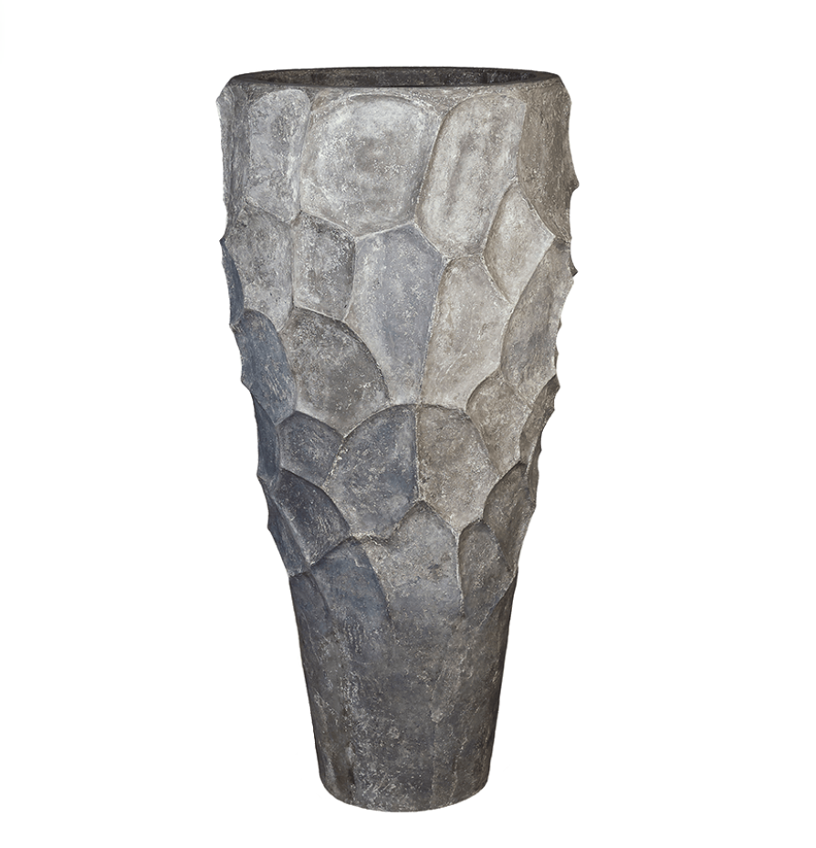 Design pot Santorini: design planter of 220 cm high. Luxury indoor pot with rock structure. Designer planters in anthracite gray. Designer pot Santorini is colourfast and maintenance-free. Stunning and large design planter with relief!