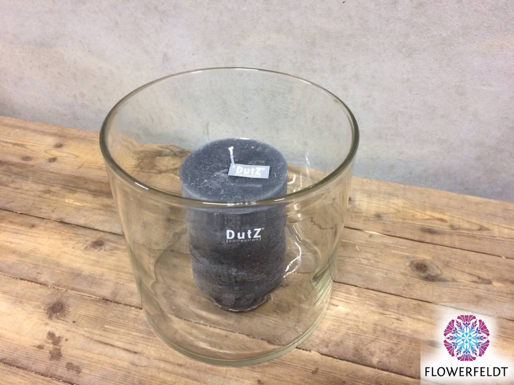 Exclusive and big hurricane of DutZ. This transparent DutZ hurricane is mouth blown. This windlight of glass comes with a luxurious DutZ candle in the color grey rustique.