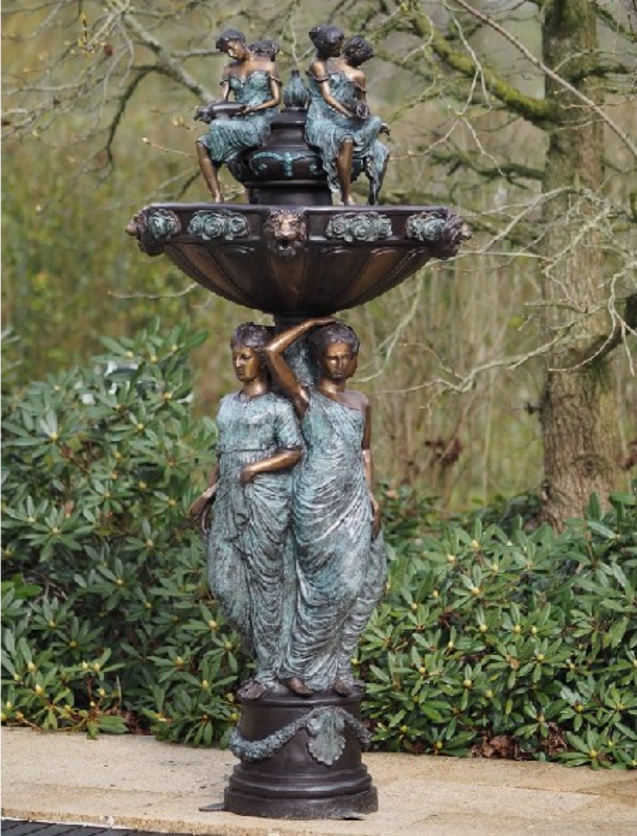Garden water feature Olympos: water features with eight Greek Goddesses. Bronze fountain of 185 cm height. Bronze fountains with a classic look. These large garden fountains are supplied with a certificate. Outdoor fountains made of top quality bronze. These richly decorated bronze fountains will last a lifetime. More exclusive water features and garden fountains online.