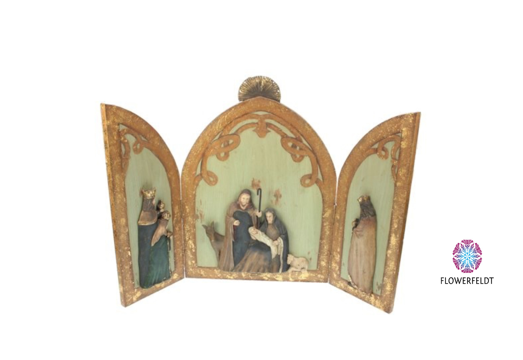 Beautiful nativity triptych with the Holy Family and Three Wise Men. This luxury nativity set is made by hand - from wood - and then painted by hand. An attractive and luxurious Christmas scene triptych for years of enjoyment. Discover the most beautiful nativity scenes and nativity sets at Flowerfeldt®!
