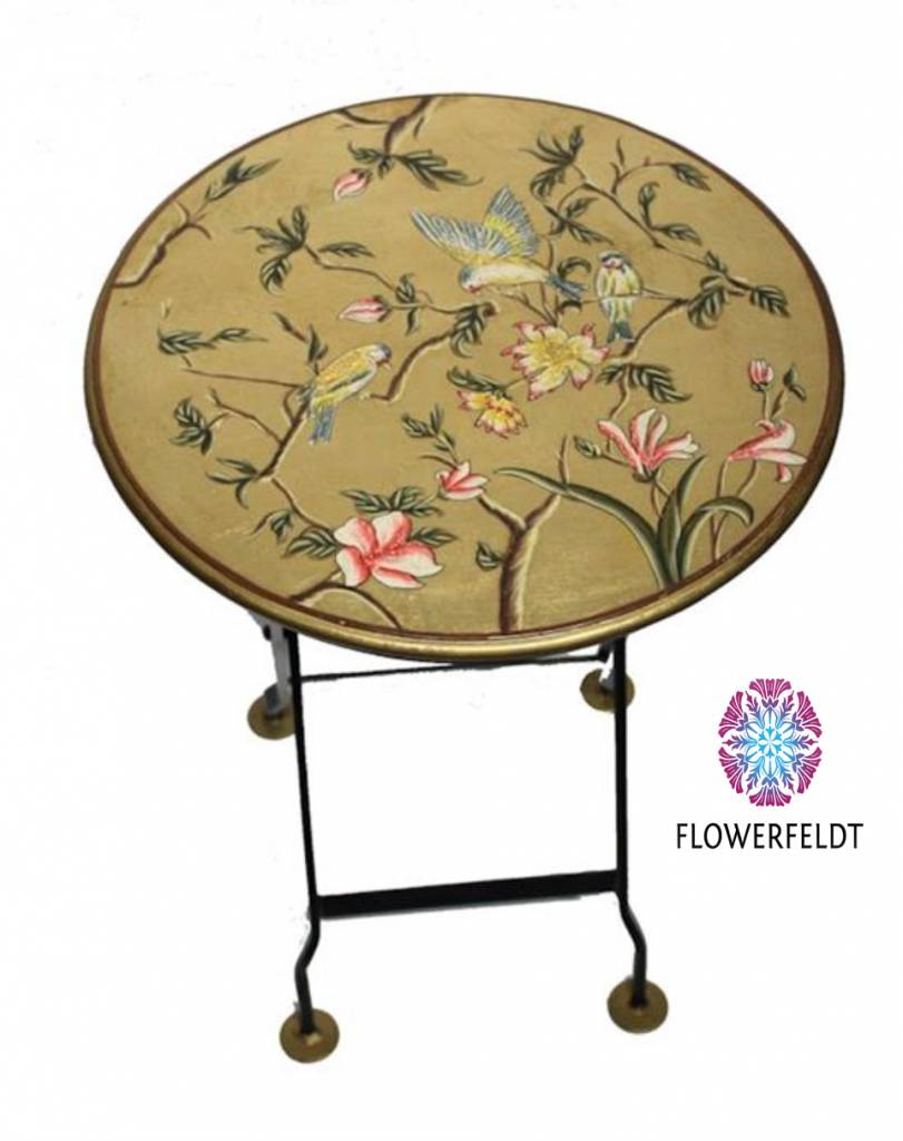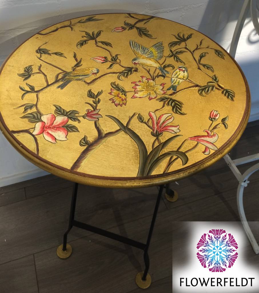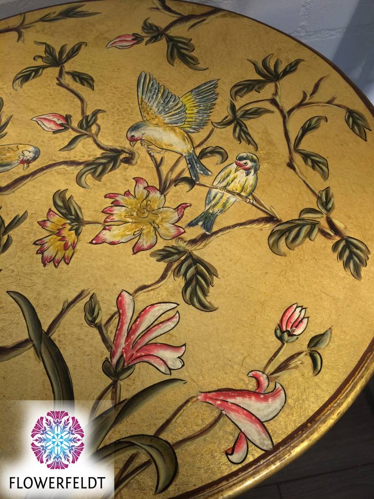 Nice old Chinese side table. The round and table top in gold has been hand painted beautifully. The 'rich' decor is a pleasure for the eye. Very handy side table and due to its size, placeable throughout the house.