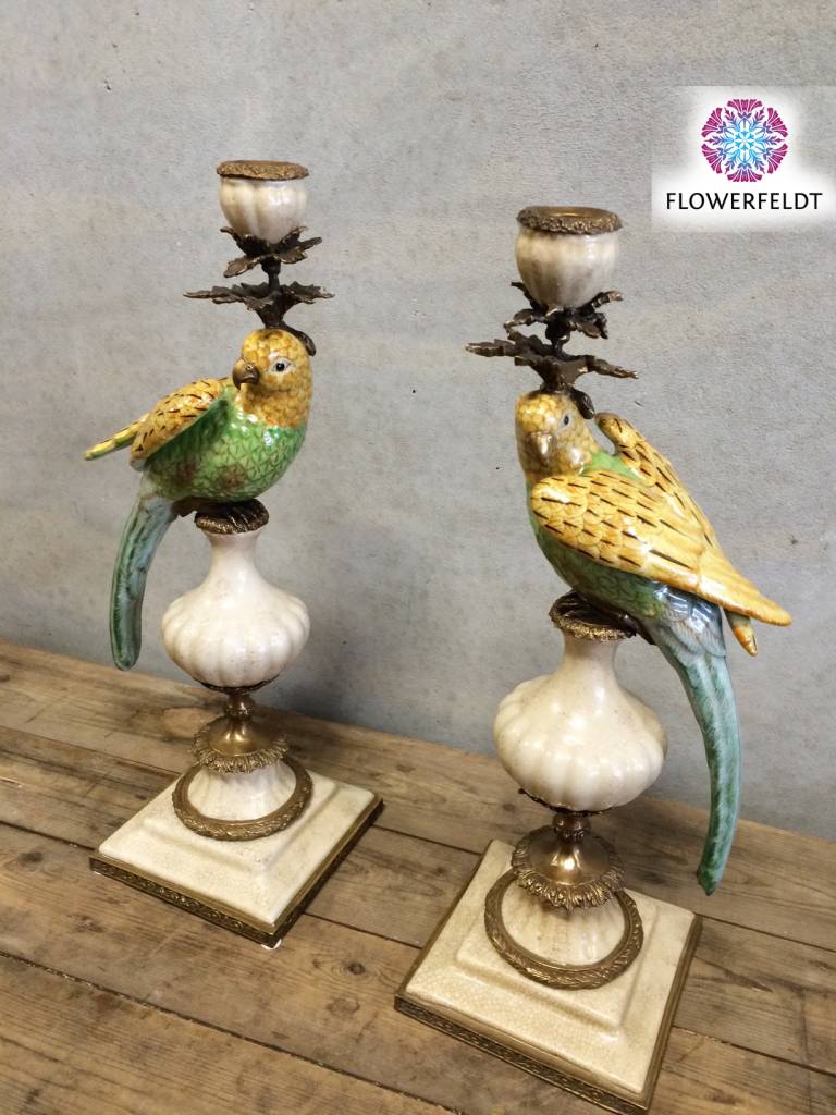 Exclusive parrot candle holder from the Flowerfeldt® collection. Stylish living accessory for people with a fine taste. These parrot candle holders are handmade and chic. Made from brass and the finest porcelain. A beautiful eye-catcher for your interior. Combining the left and right parrot candle holder can easily create an unique effect.