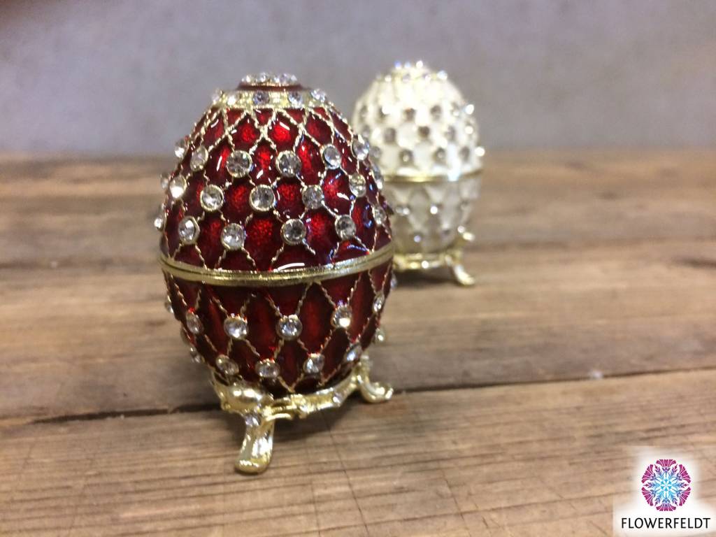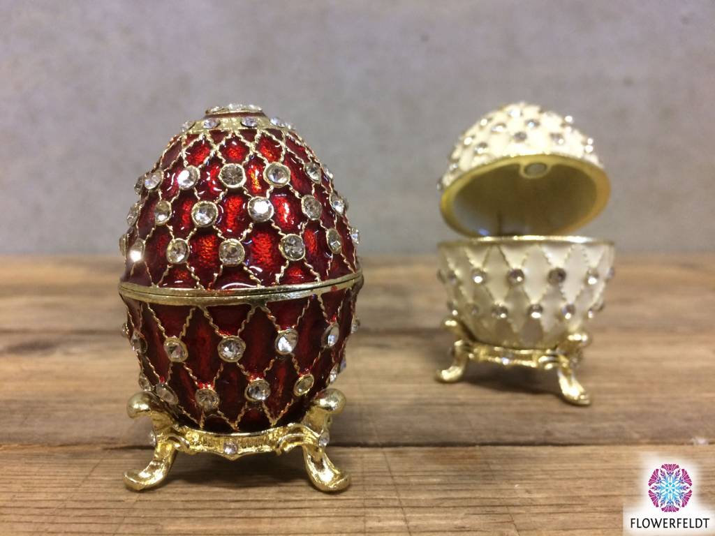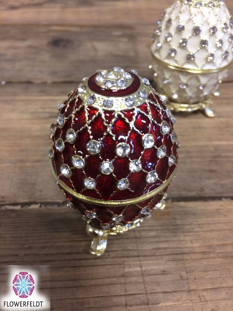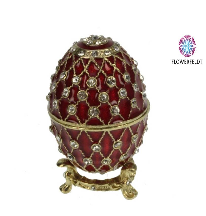 Egg on foot from the Flowerfeldt® collection. Stylish home accessory for real trendsetters. This luxurious Fabergé egg in the color red is made by hand. A Russian Easter or ornamental egg in red to enjoy for years to come!
