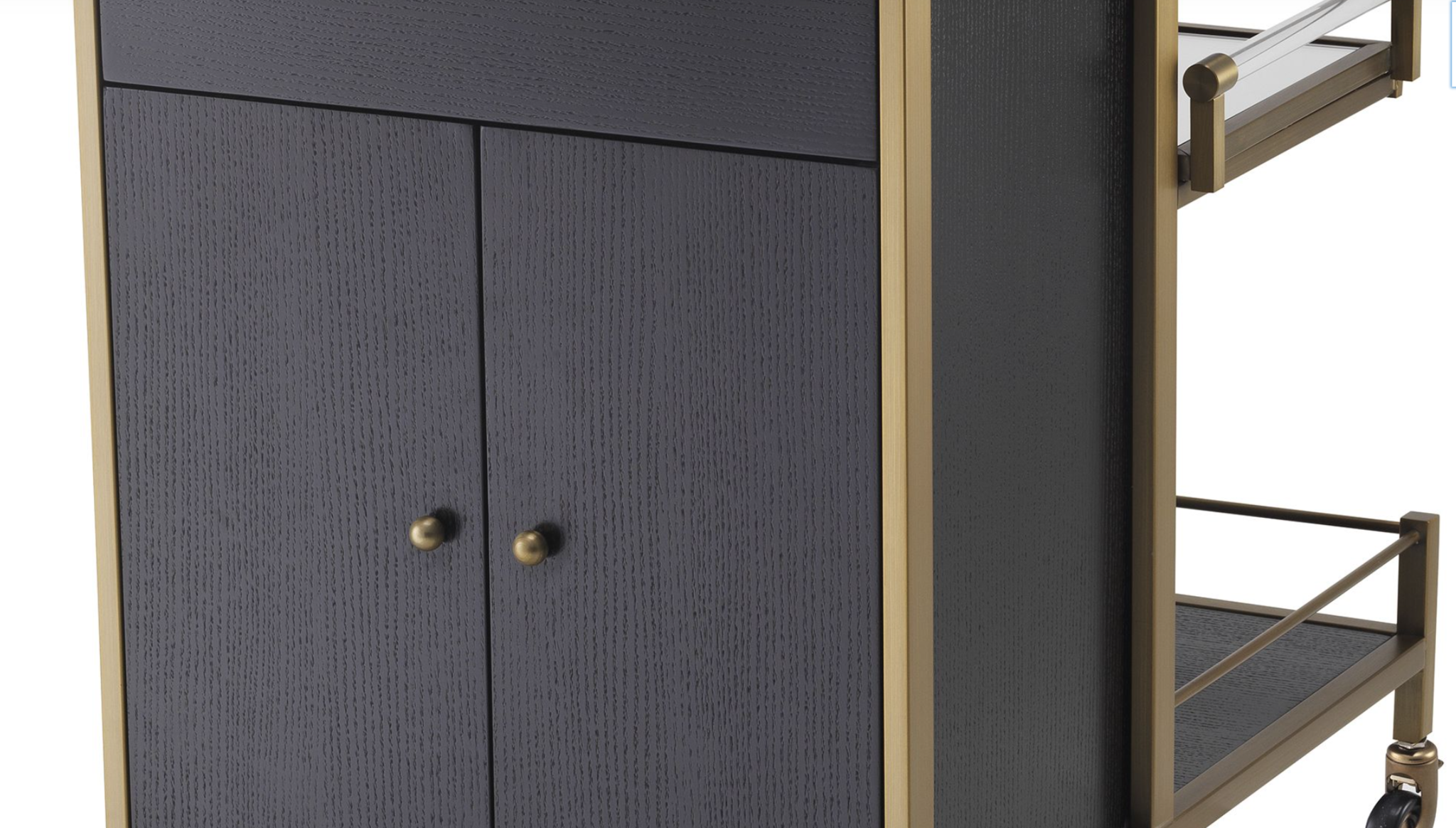 Trolley Eiffel from Eichholtz. Design serving trolley with two removable trays. Luxury serving trolley made of brass and mirrored glass. The colors blue and brass provide an exclusive look. High-quality finished and made of the best materials. Simply a designer serving trolley for years of enjoyment.