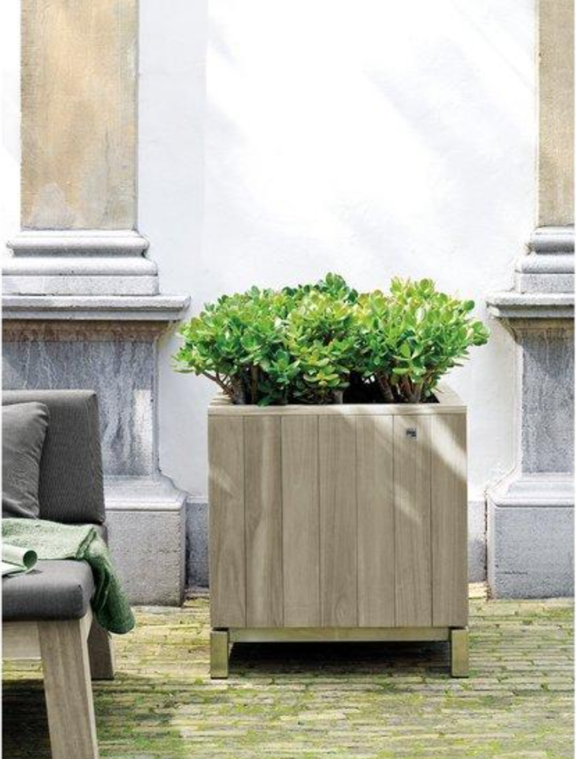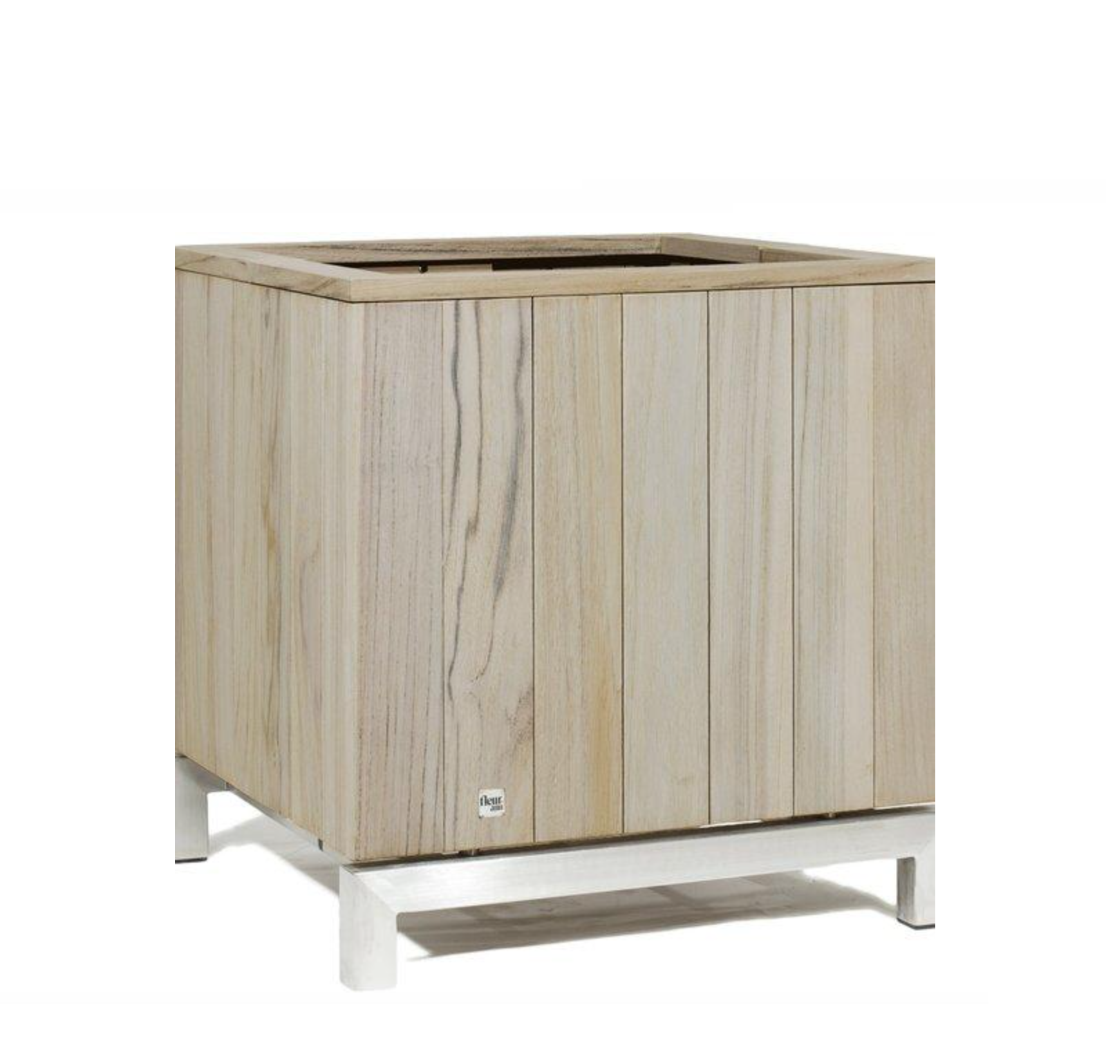 Wooden plant pot Kaprun made of whitewashed teak. Wooden planter on foot. Modern and fresh design. Wooden planters for indoor and outdoor use. Design plant pot of 65 cm height. The foot of this wooden pot is made of brushed aluminum. Wooden pots and wooden planters with a contemporary look.