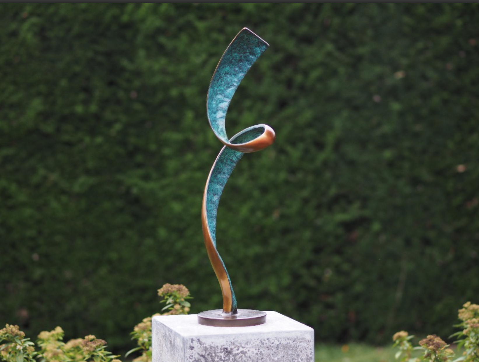 Bronzen beeld The Spiral: moderne bronzen beelden met een gladde, gepolijste zijde. De andere zijde is daarentegen in onbehandeld brons uitgevoerd. Bronzen sculptuur met een abstracte vormgeving. Moderne beelden brons met een hoogte van 56 cm. Moderne beelden voor binnen en buiten.