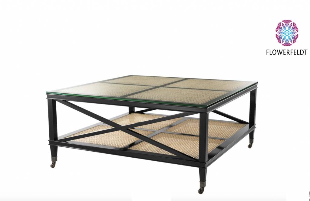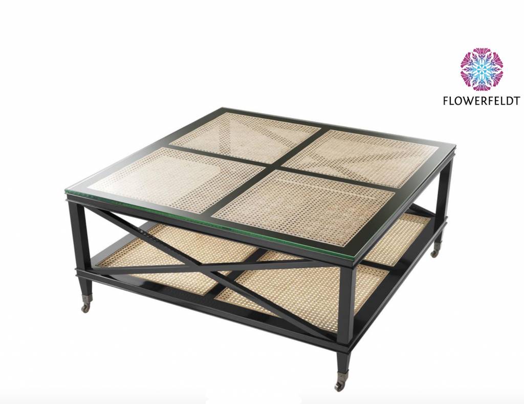 Supermooie coffee table Bahamas van Eichholtz. Zwarte salontafel met rieten tafelblad. Het tafelblad is met een glazen blad afgewerkt. Deze koloniale salontafel met bronzen wieltjes van Eichholtz maakt indruk! Hoogwaardig afgewerkt en vervaardigd van de beste materialen. Kortom, een stijlvolle salontafel voor jarenlang plezier.