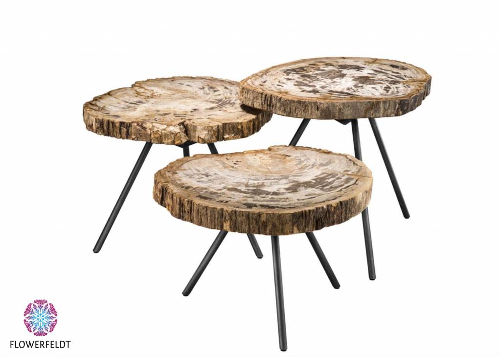 Coffee table De Soto van Eichholtz. Salontafel set met versteend houten tafelblad. Coffee table set met gunmetal poten. Hoogwaardig afgewerkt en vervaardigd van de beste materialen. Stoere boomstam coffee tables voor jarenlang plezier.