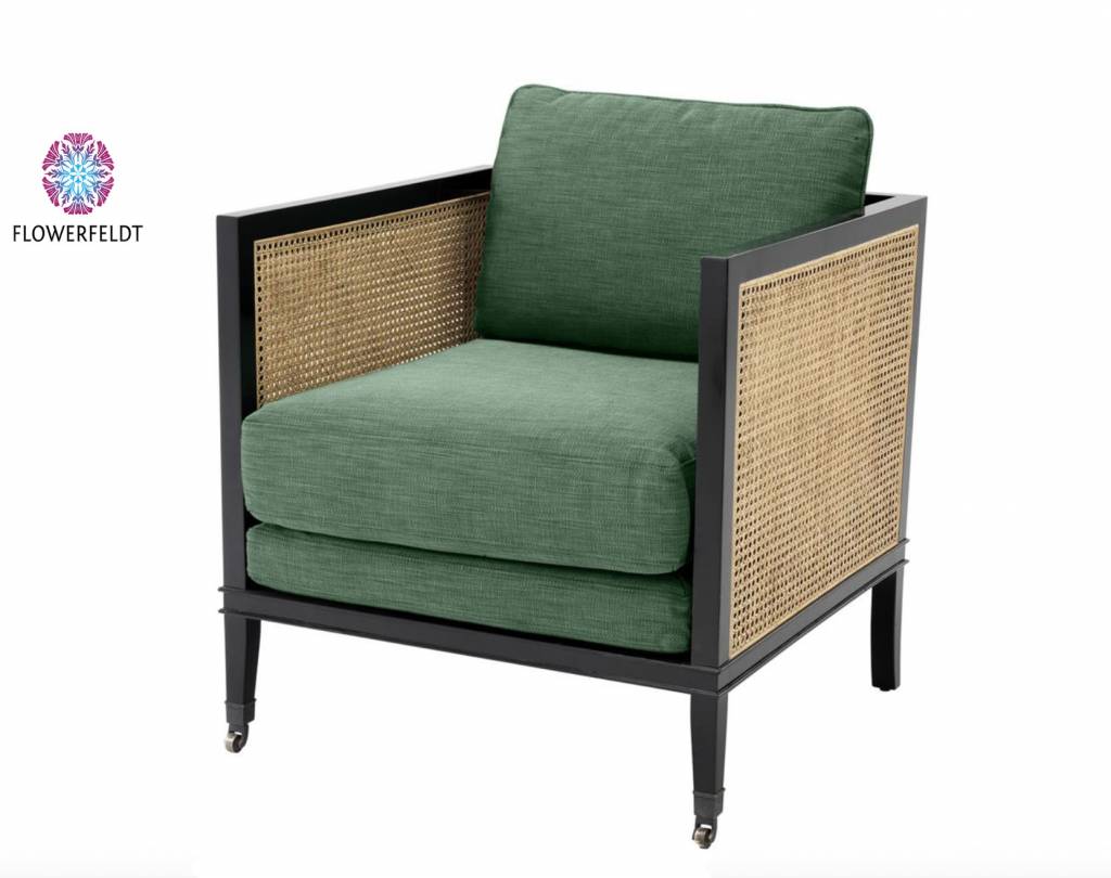 Chair Lauriston uit de collectie van het internationaal befaamde merk Eichholtz. Design stoel gemaakt van authentieke materialen. Design stoelen Lauriston zijn luxe fauteuils in albin green. Deze luxe fauteuil van Eichholtz heeft messing wieltjes en piano zwart gelakt hout. De rug en leuningen van deze klassieke design stoel zijn gemaakt van natuurlijk riet. Design stoel Lauriston is supermooi te combineren met de Bahamas collectie van Eichholtz.