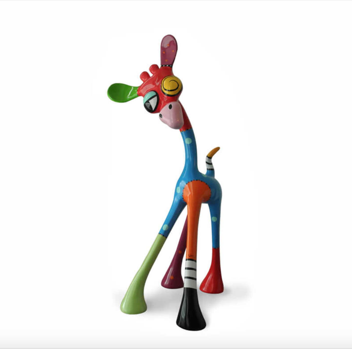 Giraf beeld Pax van Jacky Art. Groot giraf beeld uit de collectie van kunstenares Jacky Zegers. Giraffe beeld Pax van Jacky Zegers: een modern en kleurrijk giraf beeld van 105 cm hoogte. Eigenzinnige giraf beelden met een mooie en vrolijke twist. Giraffe beelden die zowel binnen als buiten geplaatst kunnen worden. Deze grote giraf figuren of giraf sculpturen zijn met de hand beschilderd. Unieke giraf sculpturen voor binnen én buiten dat gegarandeerd voor een glimlach zorgt!