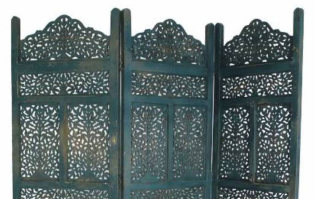 Supergave room divider in Moorse stijl. Deze houten kamerscherm van 180 cm hoog is helemaal met de hand bewerkt. Unieke kamerscherm in turquoise blauw. Deze kamerschermen van hout bestaan uit drie inklapbare panelen. Een prachtige eye-catcher voor je slaapkamer!