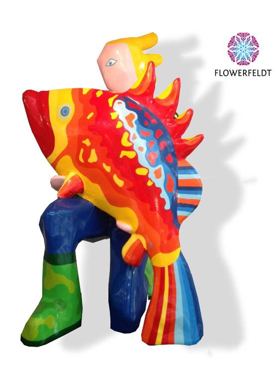 Kunstbeeld Fish and Man is een exclusief kunstbeeld uit de Flowerfeldt® collectie. Extra groot kunstbeeld gemaakt van staal en polyester. Dit vrolijke kunstbeeld van een hurkende man met gevangen vis is afgewerkt met 5 tot 7 lagen speciale coating lak. Tevens is dit abstracte kunstbeeld met de hand beschilderd. Kunstbeeld Fish and Man is UV-bestendig en bestand tegen vorst. Daardoor is dit kunstbeeld van Jenny Derksen zeer geschikt voor binnen en buiten.Over kunstenaar Jenny Derksen