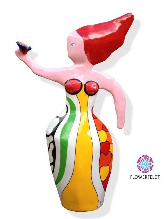 Kunstbeeld Misses Sunshine is een exclusief kunstbeeld uit de Flowerfeldt® collectie. Extra groot kunstbeeld gemaakt van staal en polyester. Dit grote kunstbeeld van een vrouw in een vrolijke, zomerse jurk is afgewerkt met 5 tot 7 lagen speciale coating lak. Tevens is dit abstracte kunstbeeld van Jenny Derksen met de hand beschilderd. Kunstbeeld Misses Sunshine is UV-bestendig en bestand tegen vorst. Daardoor is dit kunstbeeld van Jenny Derksen zeer geschikt voor buiten.