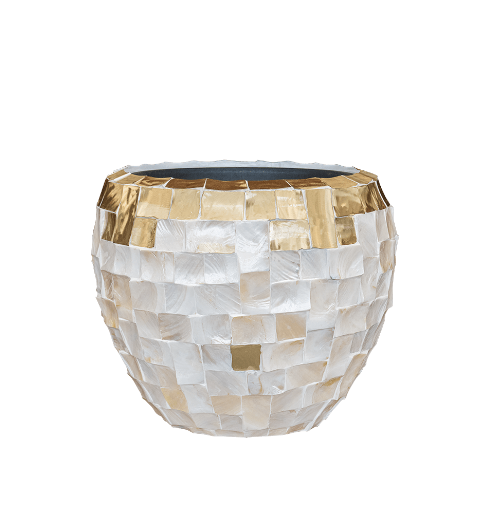 Stijlvolle potten Singapore gemaakt van echte oesterschelpen. Luxe schelpenvazen in de kleuren goud, wit en beige. Exclusieve potten met een doorsnede van 50 cm. Luxe bloempotten binnen met klasse en elegantie! Bloempotten 45 cm hoog waar je niet op uitgekeken raakt!