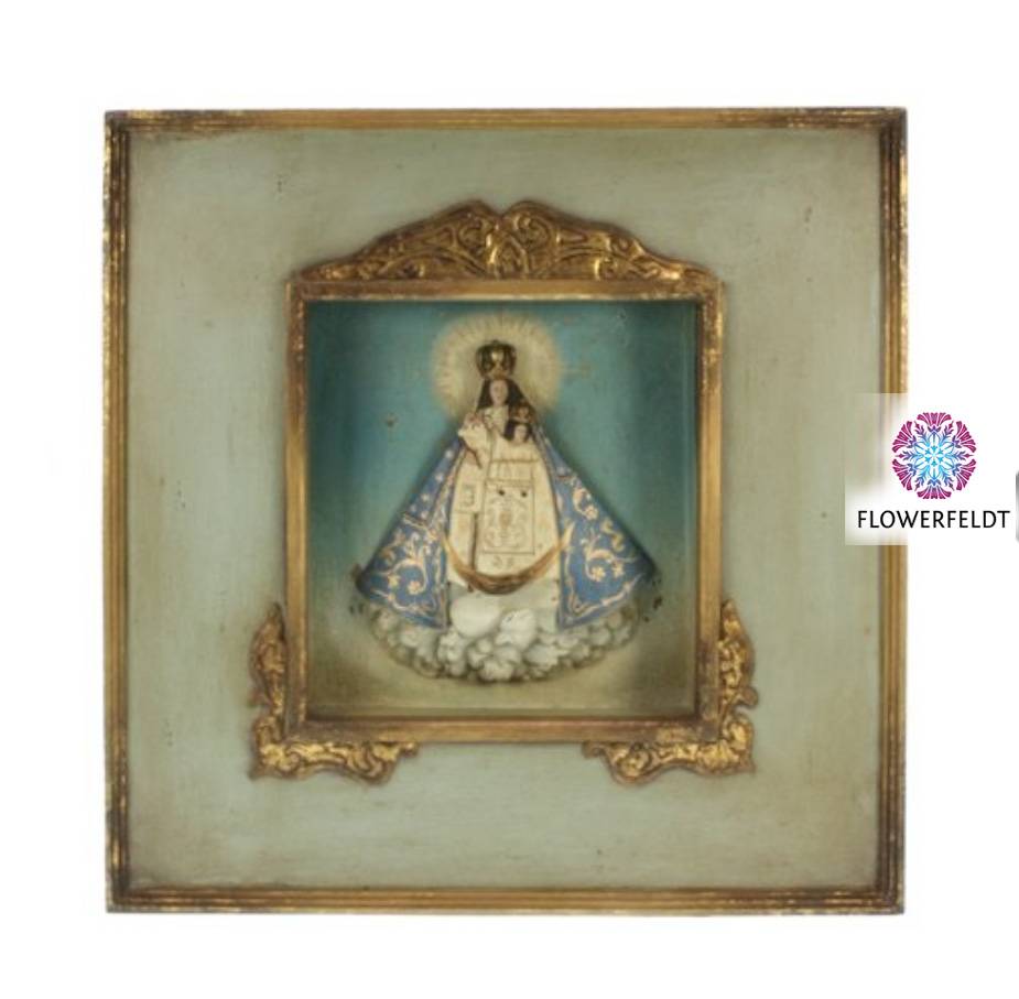 Madonna op wolk uit de collectie van Flowerfeldt®. Stijlvolle woonaccessoire voor echte smaakmakers. Deze Madonna met kind is handgemaakt. Gewoon een hemels mooie Maria icoon. Al het goede komt van boven! Daarom verdient deze Madonna - ingelijst met glas - een mooi plekje aan de muur.