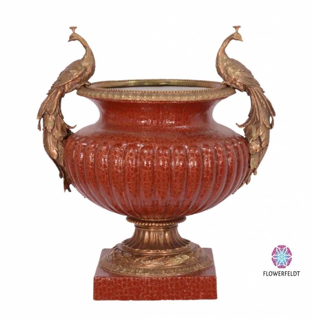 Exclusieve rode decoratiepot. Deze bijzondere art deco pot in de kleur rood straalt luxe en grandeur uit. Deze sierpotten met pauwen zijn gemaakt van hoogwaardig porselein en messing. Deze vintage pauwen potten rood zijn niet alleen rijkgedecoreerd, maar door de vormgeving ook heerlijk uitgesproken! Kortom, een rode pot met allure.