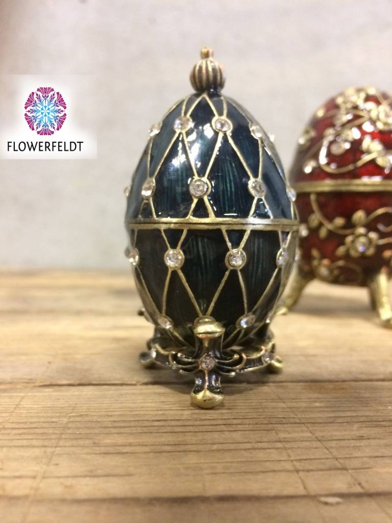 Ei op voetje uit de collectie van Flowerfeldt®. Stijlvolle woonaccessoire voor echte smaakmakers. Dit luxe Fabergé ei in de kleur blauw is helemaal met de hand gemaakt. Een blauwe Russisch Paas- of sierei voor jarenlang plezier!