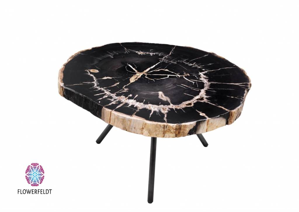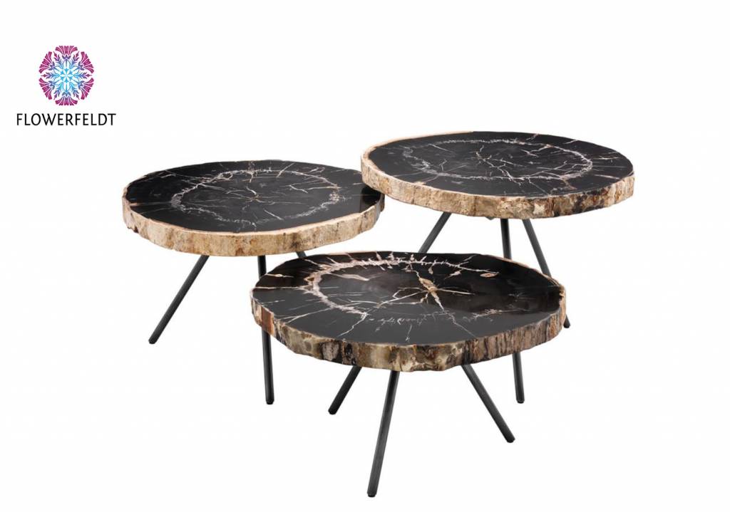 Salontafel De Soto van Eichholtz. Luxe salontafel set met versteend houten tafelblad. Deze coffee table set heeft zwarte poten. Hoogwaardig afgewerkt en vervaardigd van de beste materialen. Exclusieve boomstamtafel set voor jarenlang plezier.