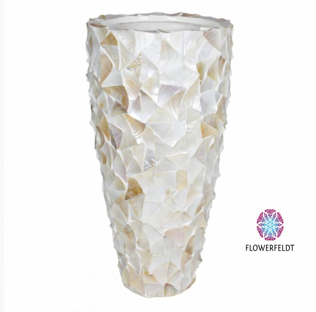 Witte schelpen vaas Jeddah L van 96 cm hoog. Witte schelpenvazen Jeddah L zijn gemaakt van echte schelpen. Bloempotten wit groot voor hoge kamerplanten. Grote witte potten met creme witte schelpen decoreert. De mooiste schelpenvazen en hoge witte potten koop je bij Flowerfeldt®.