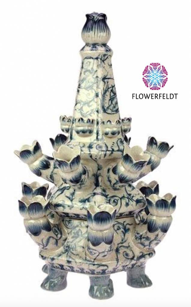 Deze tulpenvaas Deluxe van Flowerfeldt® is een modern statussymbool in de kleuren blauw crème. Delfts blauwe tulpenvaas gedecoreerd met bloemen en engelen.