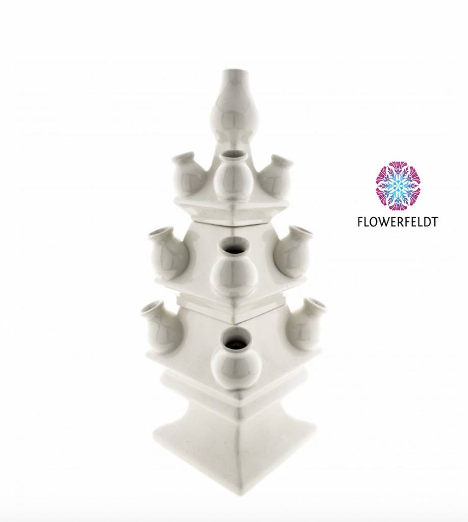 Stijlvolle piramide tulpenvaas in effen wit. Deze mooie tulpen vaas bestaat uit drie stapelbare delen. Extra hoge decoratievaas voor losse snijbloemen. Deze creme witte tulpen vaas heeft een stoere uitstraling. Een bijzonder product en wereldwijd stijlicoon!