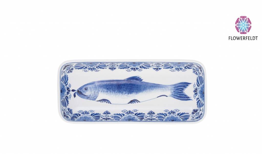 Porseleinen visschaal in Delfts blauw. Rechthoekige visschalen van het beste porselein. Deze delfts blauwe vis schalen zijn zeer verfijnd afgewerkt. Delfts blauwe haringschaal gedecoreerd met een haring en bloemmotieven. Vakkundig door een meesterschilder beschilderd. Tijdloze haring schaal voor echte fijnproevers!
