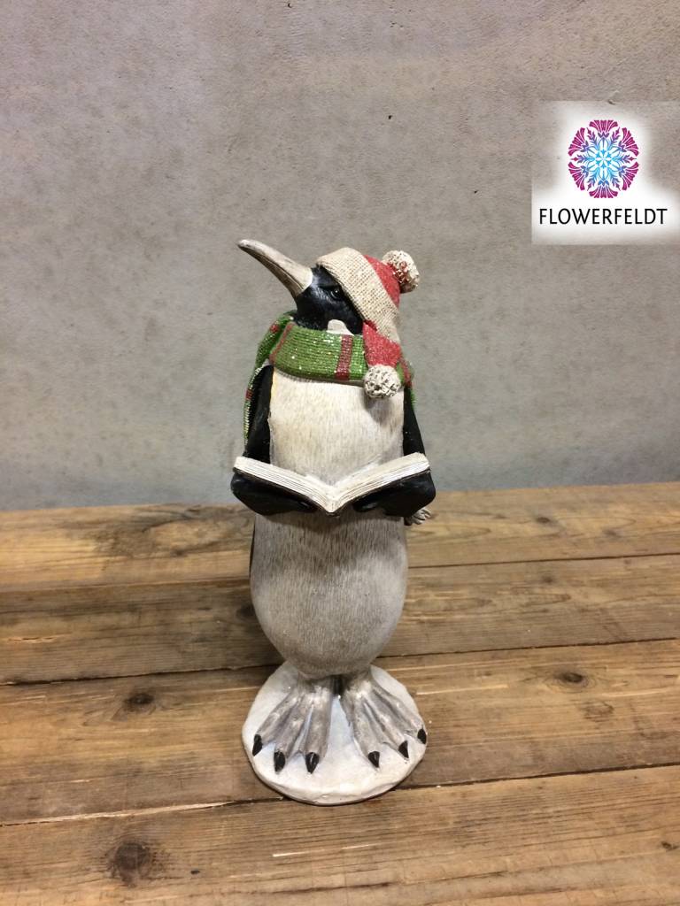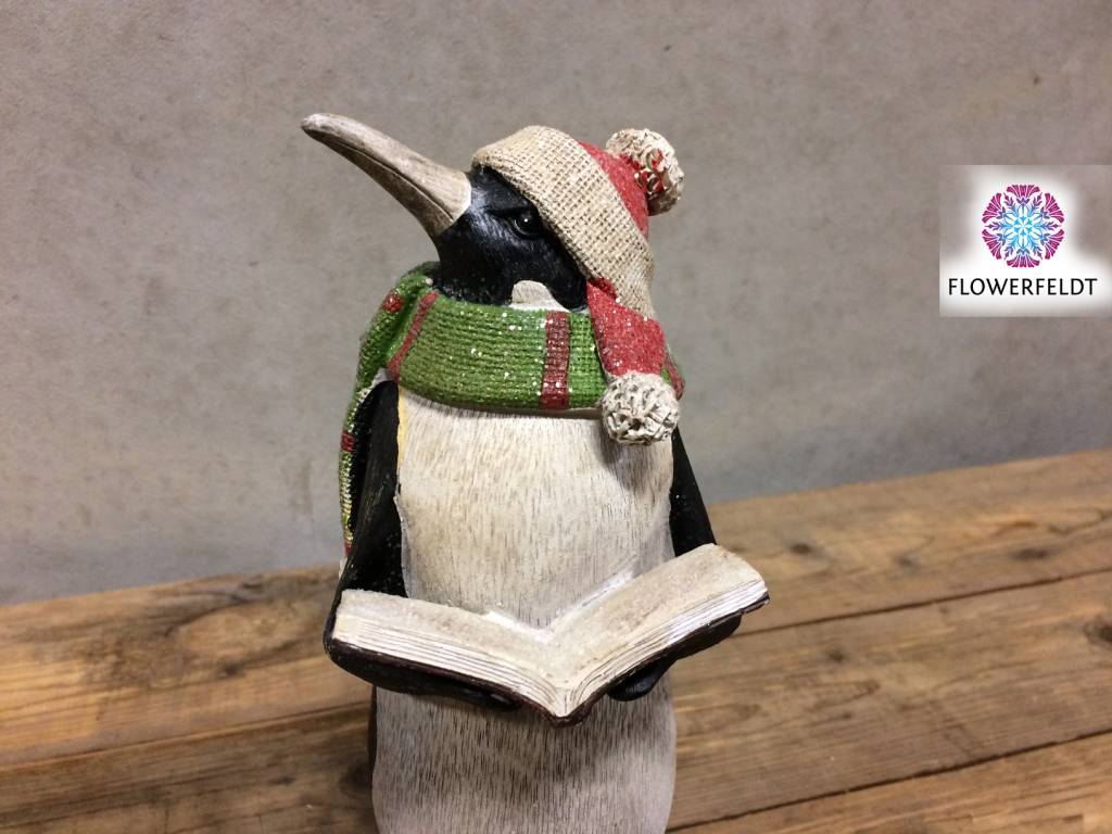 Supercoole winter pinguin. Luxe pinguin beeld met boek is gemaakt van polyresin. Deze grappige pinguin beelden zijn helemaal winterproof. De winter pinguins zijn dik aangekleed met groene sjaal en wintermuts. Kortom, met deze pinguin kom je de winter goed door.